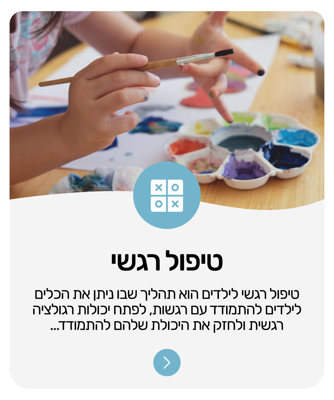 טיפול רגשי הוא תהליך מקצועי שמטרתו לסייע לילדים ובני נוער להתמודד עם קשיים רגשיים, התנהגותיים וחברתיים. הטיפול מתבצע באמצעות שיחות, משחק, אומנות וגישות נוספות, בהתאם לצורכי הילד.